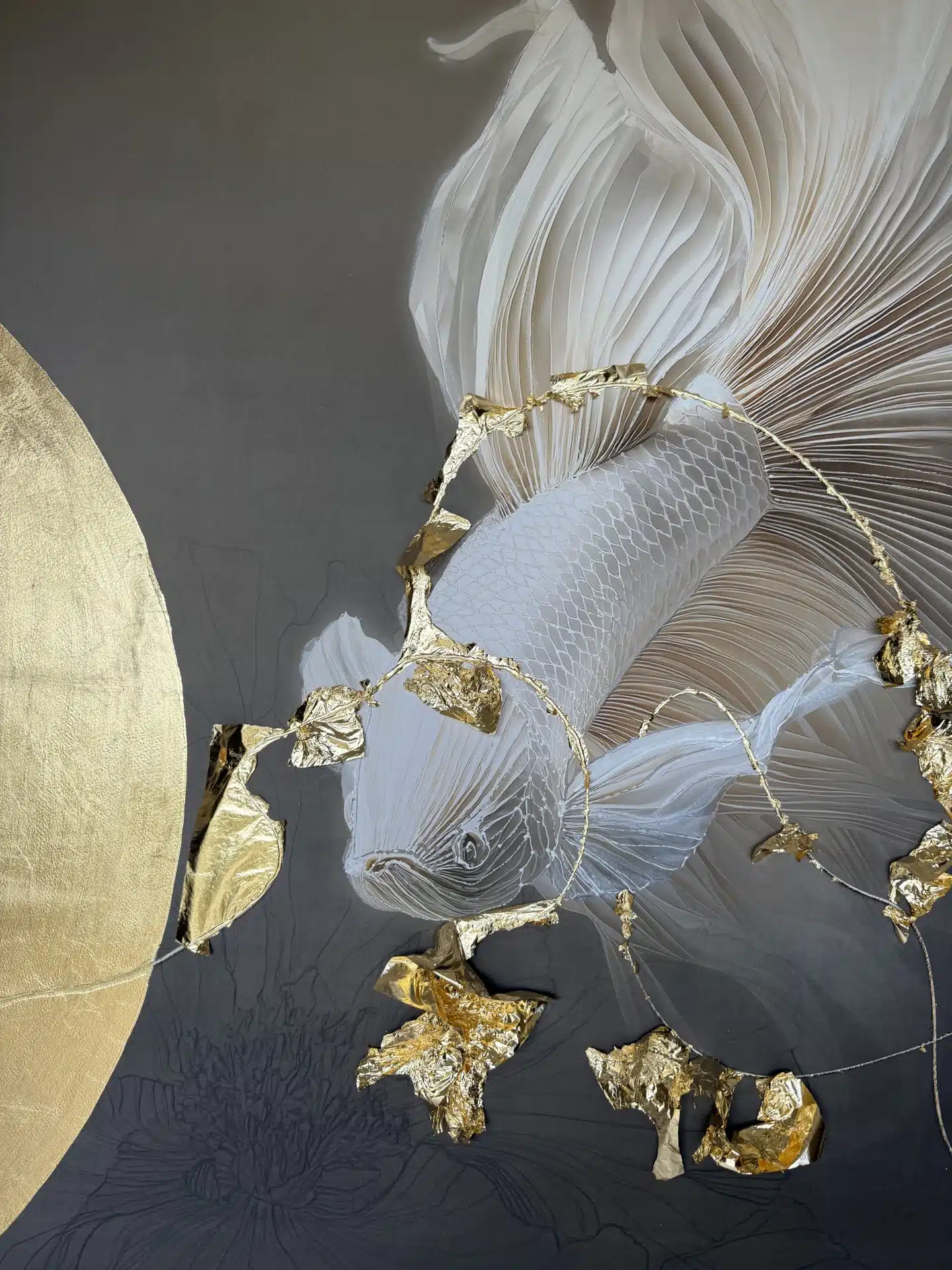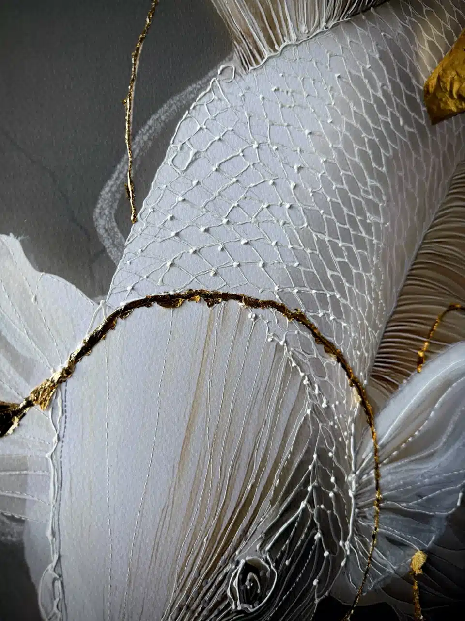 Technique: Acrylic ink/paint, UV print, fineliner, charcoal and gold leaf.