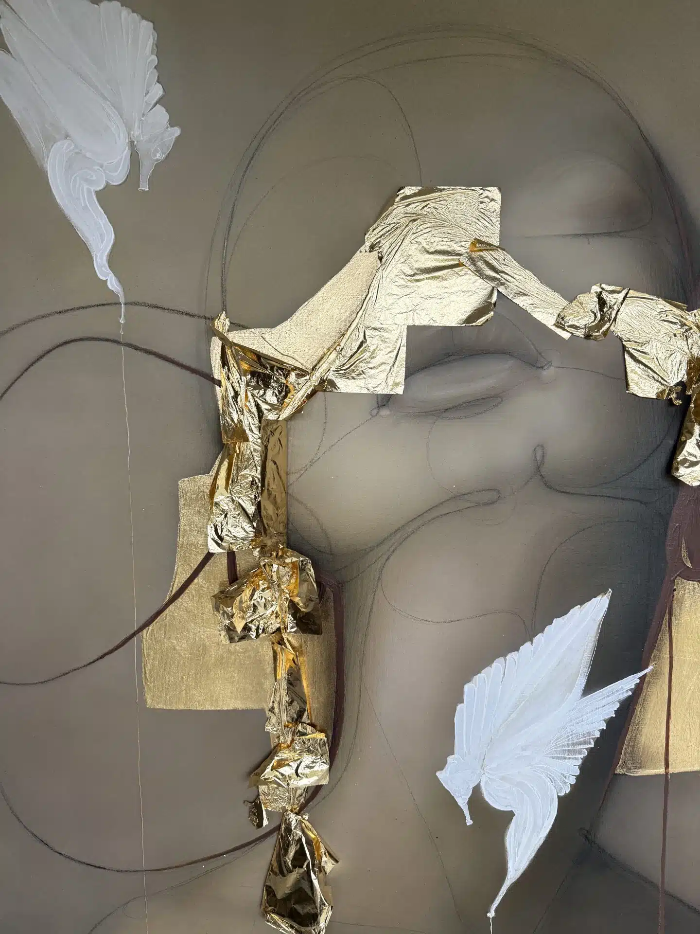 The work combines many layers of acrylic paint applied with brushes, airbrushed ink, crayon, and gold leaf.