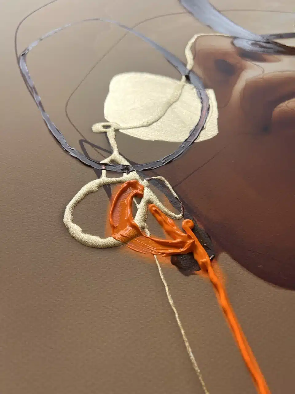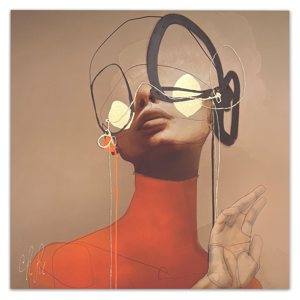 Technique: Acrylic ink/paint, UV print, fineliner, charcoal and gold leaf.