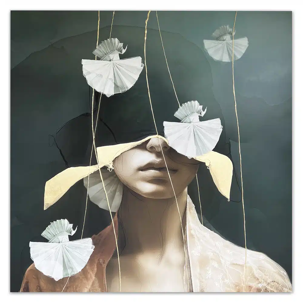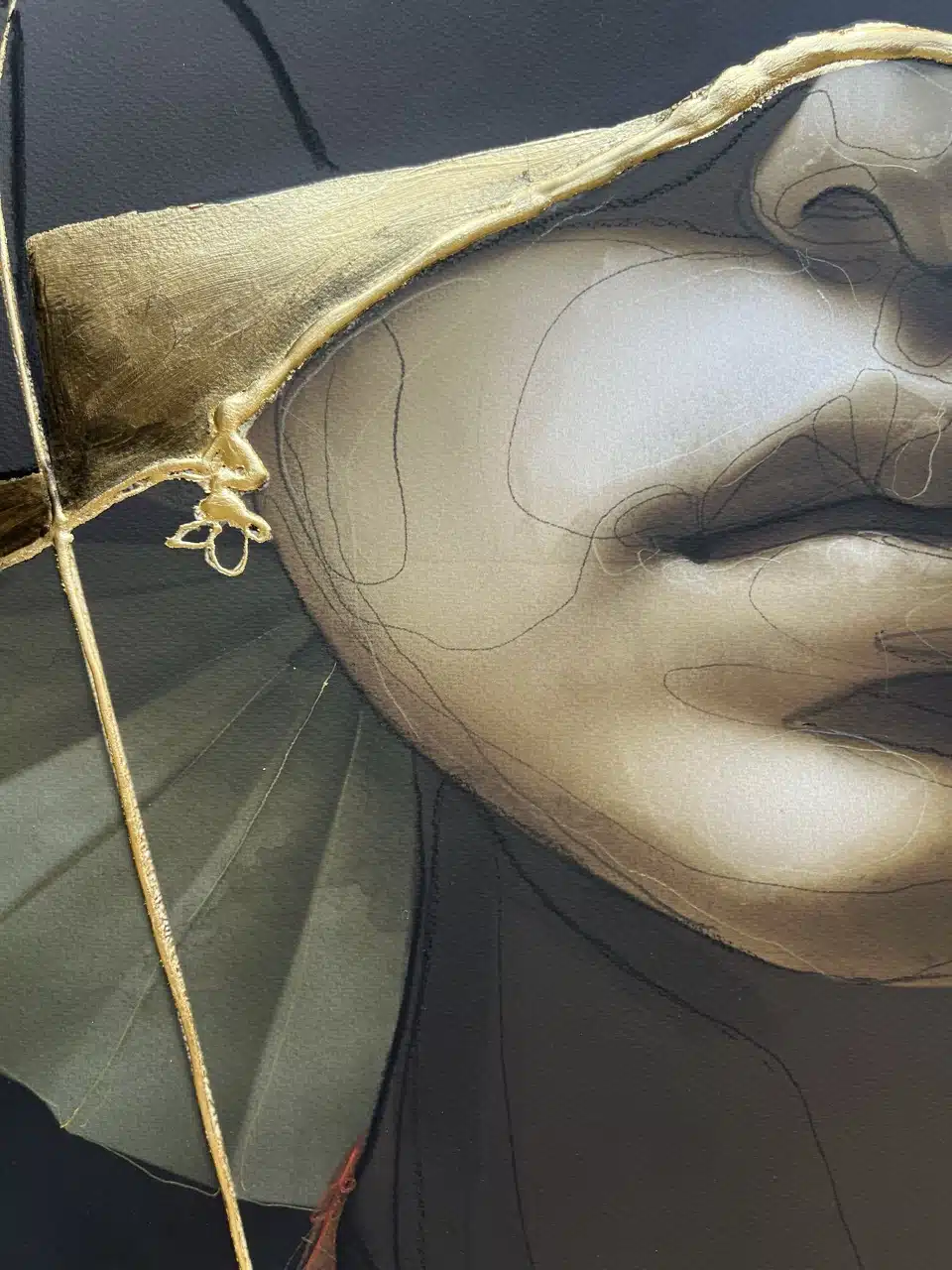 Technique: Acrylic ink/paint, UV print, fineliner, charcoal and gold leaf.