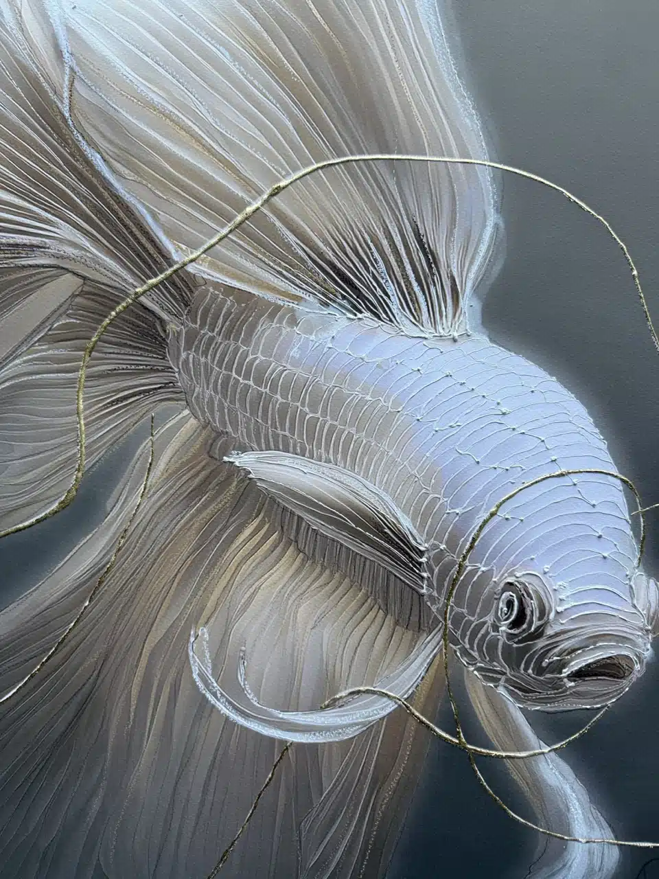 Technique: Acrylic ink/paint, UV print, fineliner, charcoal and gold leaf.