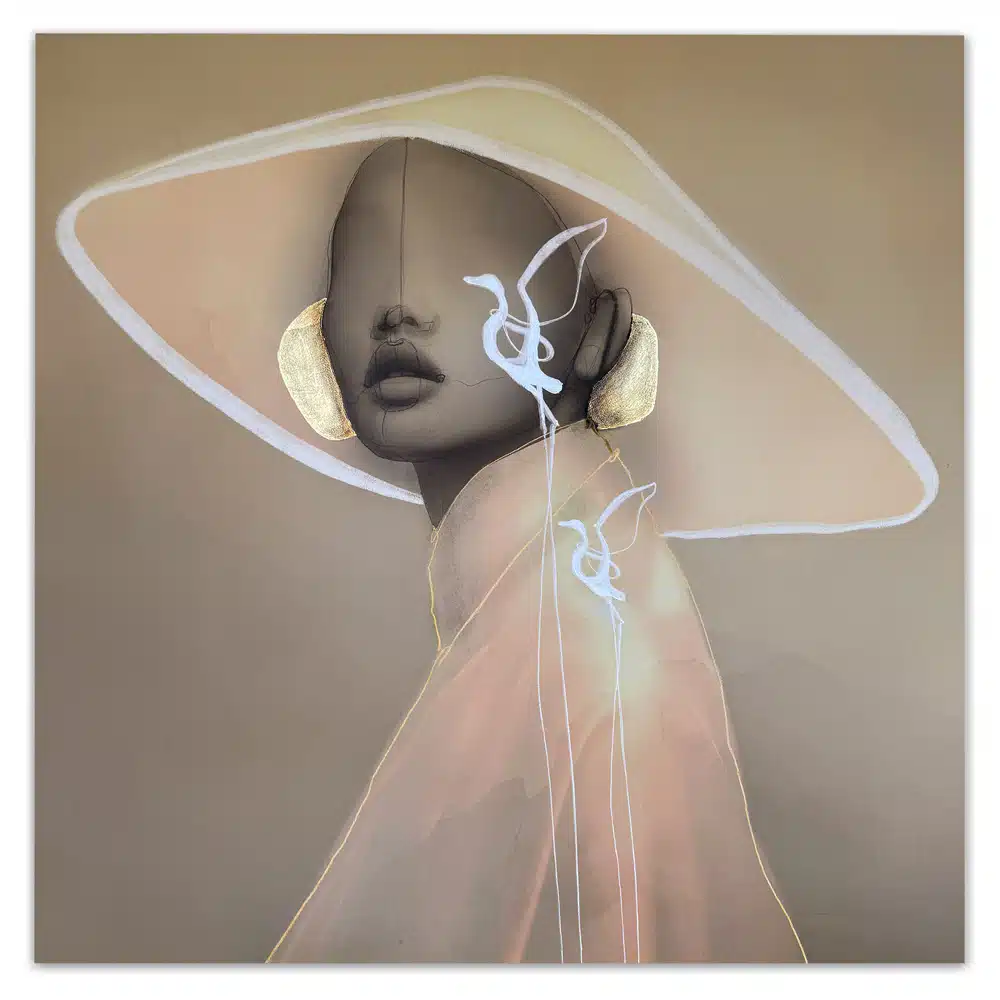 Technique: Acrylic ink/paint, UV print, fineliner, charcoal and gold leaf.