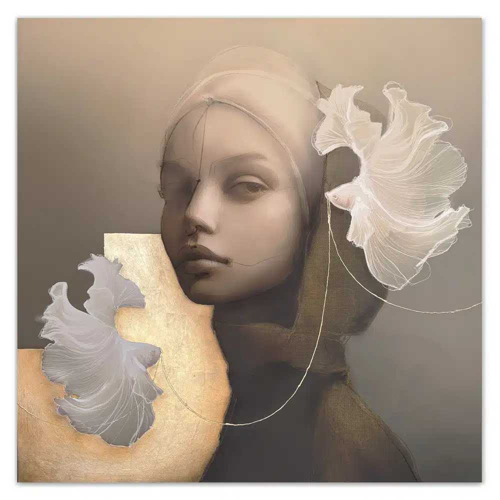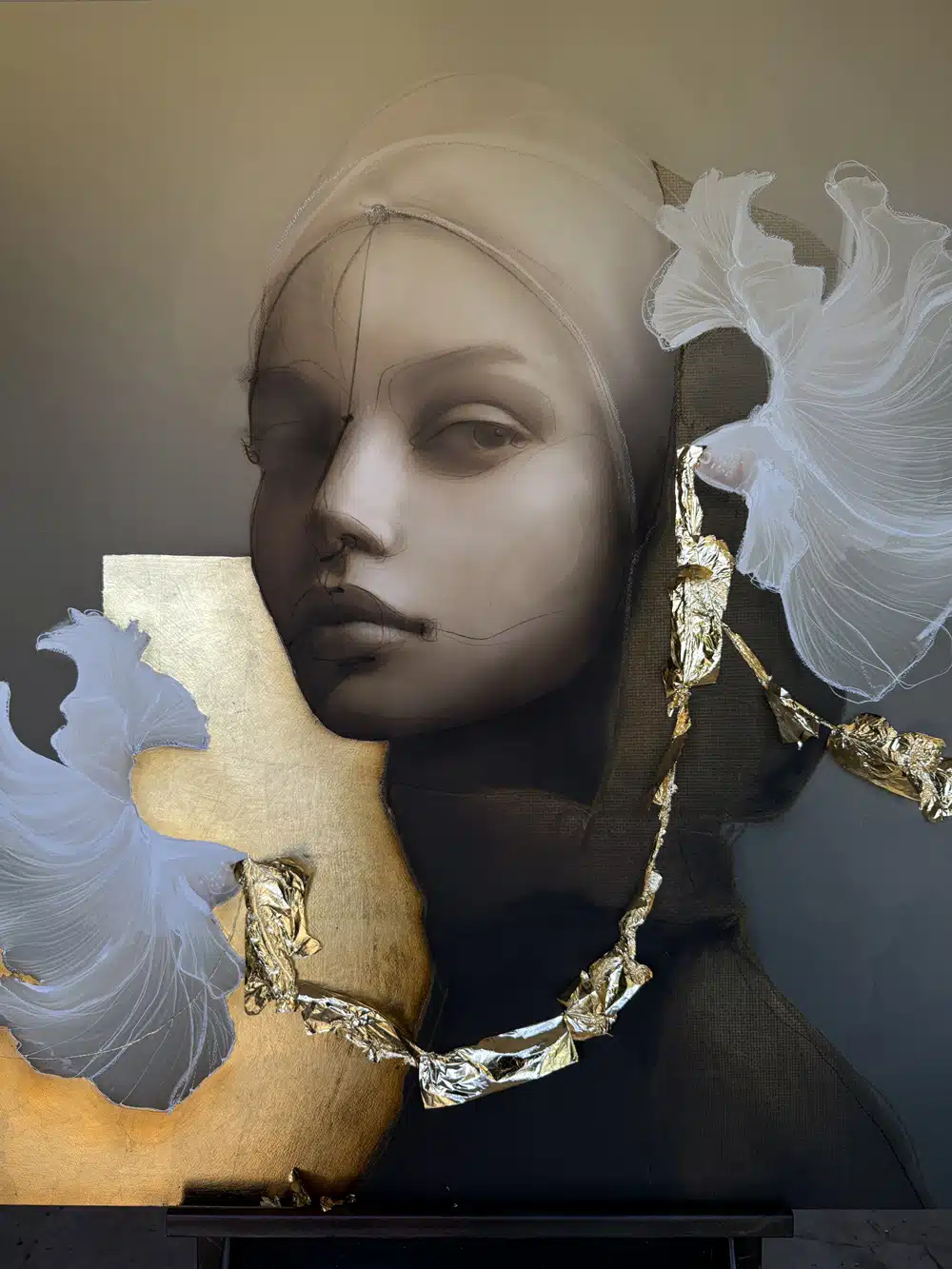 Technique: Acrylic ink/paint, UV print, fineliner, charcoal and gold leaf.