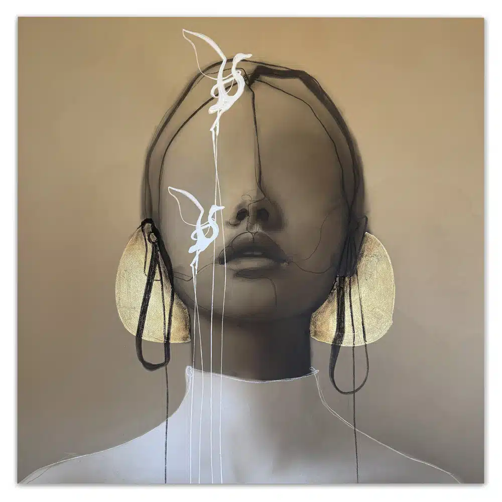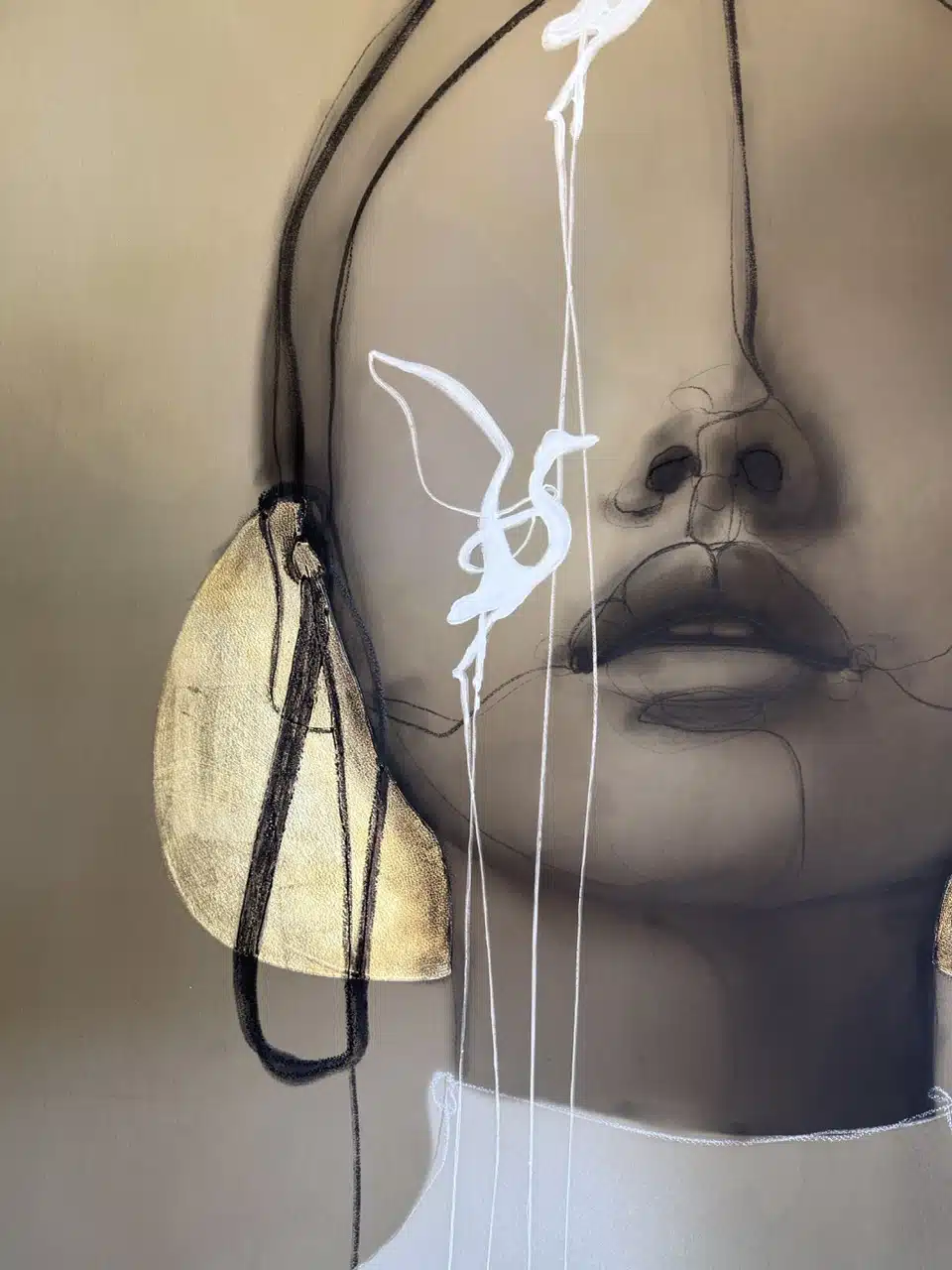 Technique: Acrylic ink/paint, UV print, fineliner, charcoal and gold leaf.